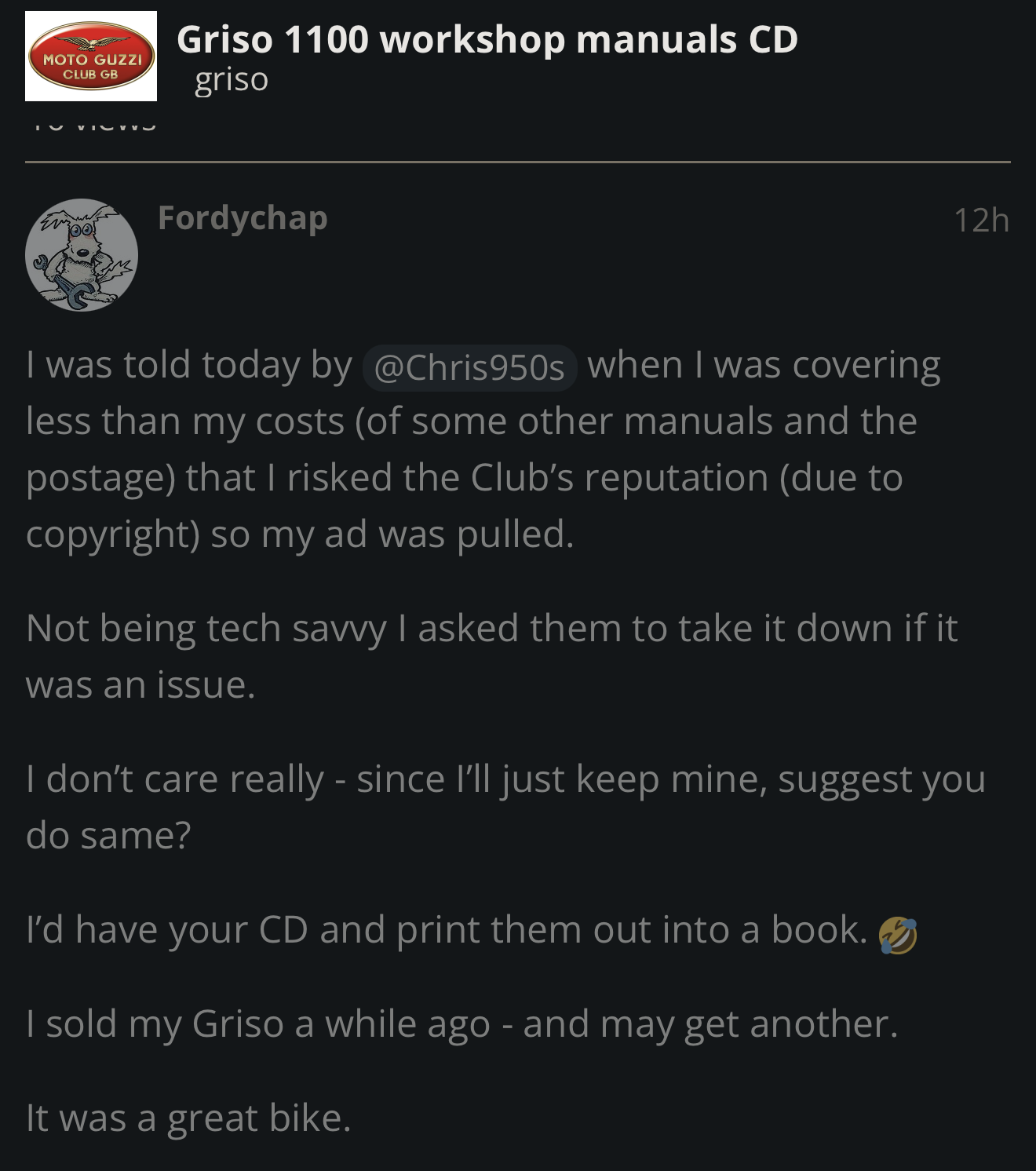 I want to participate in a club that is about my passion for Italian bikes and the Guzzis I own, but it sadly appears I can no longer do that in a simpler analogue world. I had thought those books might possibly help another dinosaur!