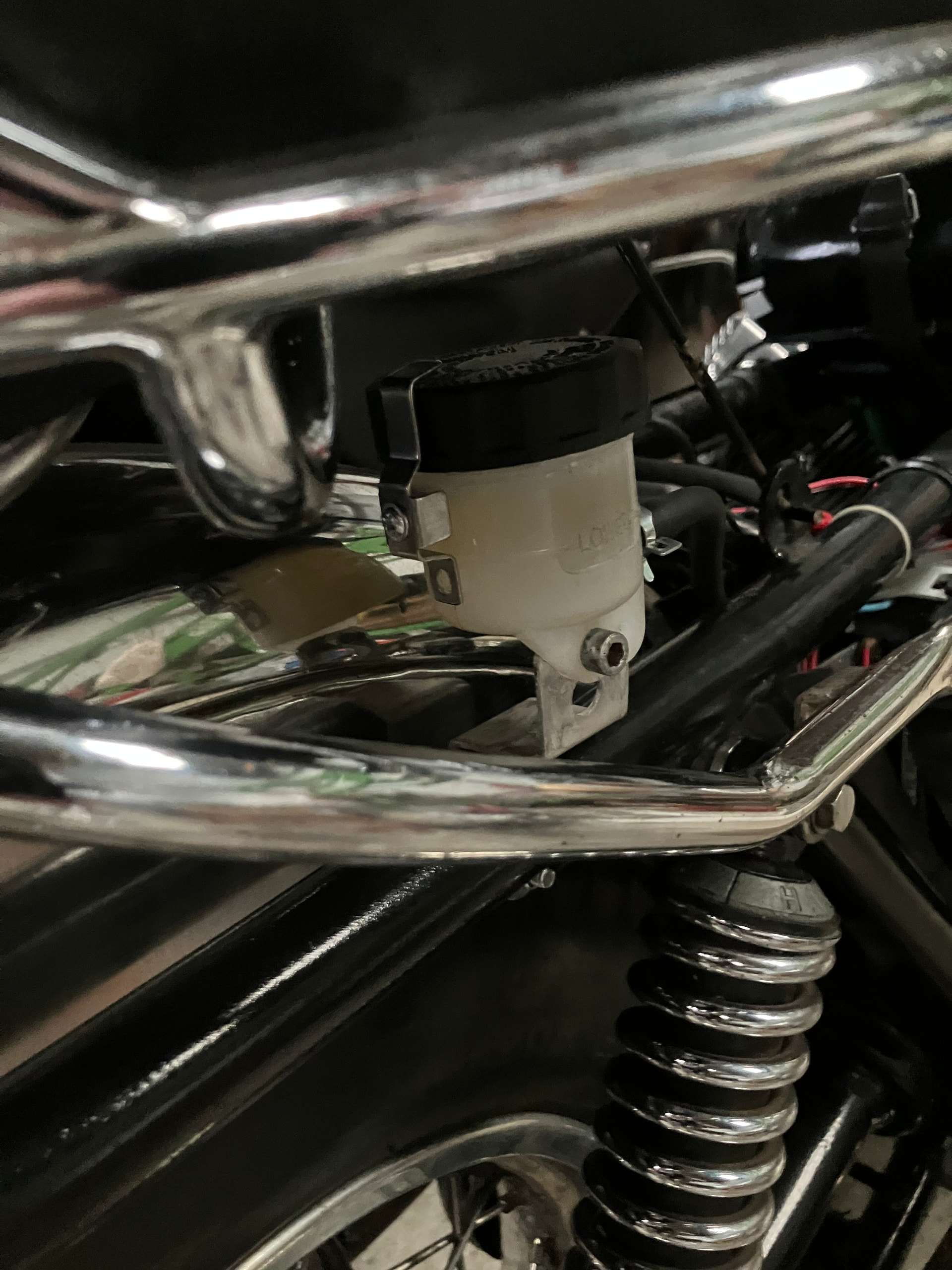 Eventually got a day to fit the slightly bigger new PS16 Brembo rear master cylinder. The original one gave a good brake but even correctly bled and adjusted allowed the pedal to hit the foot board if you tried. Because its all a bit space compromised under the cover I had to figure out on how to site the master cylinder by making up a joining offset lower mounting bracket and a longer operating rod. This to also allow the existing brake pipe to reach its new destination and get a decent angle for the operating rod to be efficient. The new longer operating rod needed threaded at each end to accept pivot pieces at the m/c and foot brake. I used a remote Nissin brake fluid reservoir of about 50 ml capacity with a long hose. I mounted this off existing frame holes to sit alongside the rear mudguard and under the rear of the seat. The existing brake line to the linked compensator did fit. The M/C operating arm and brake activation is very sensitive to being even slightly on so required some return springs. The flasher units got moved a couple of times until I was happy they were insulated from vibrations and any interference from moving parts.