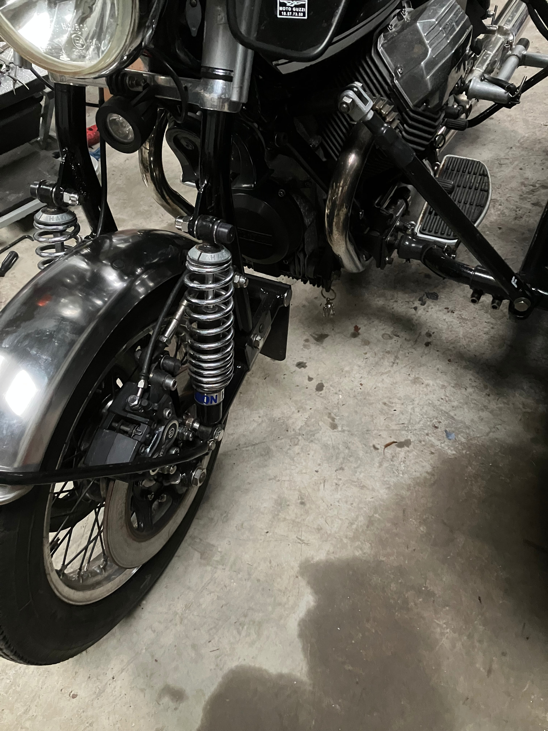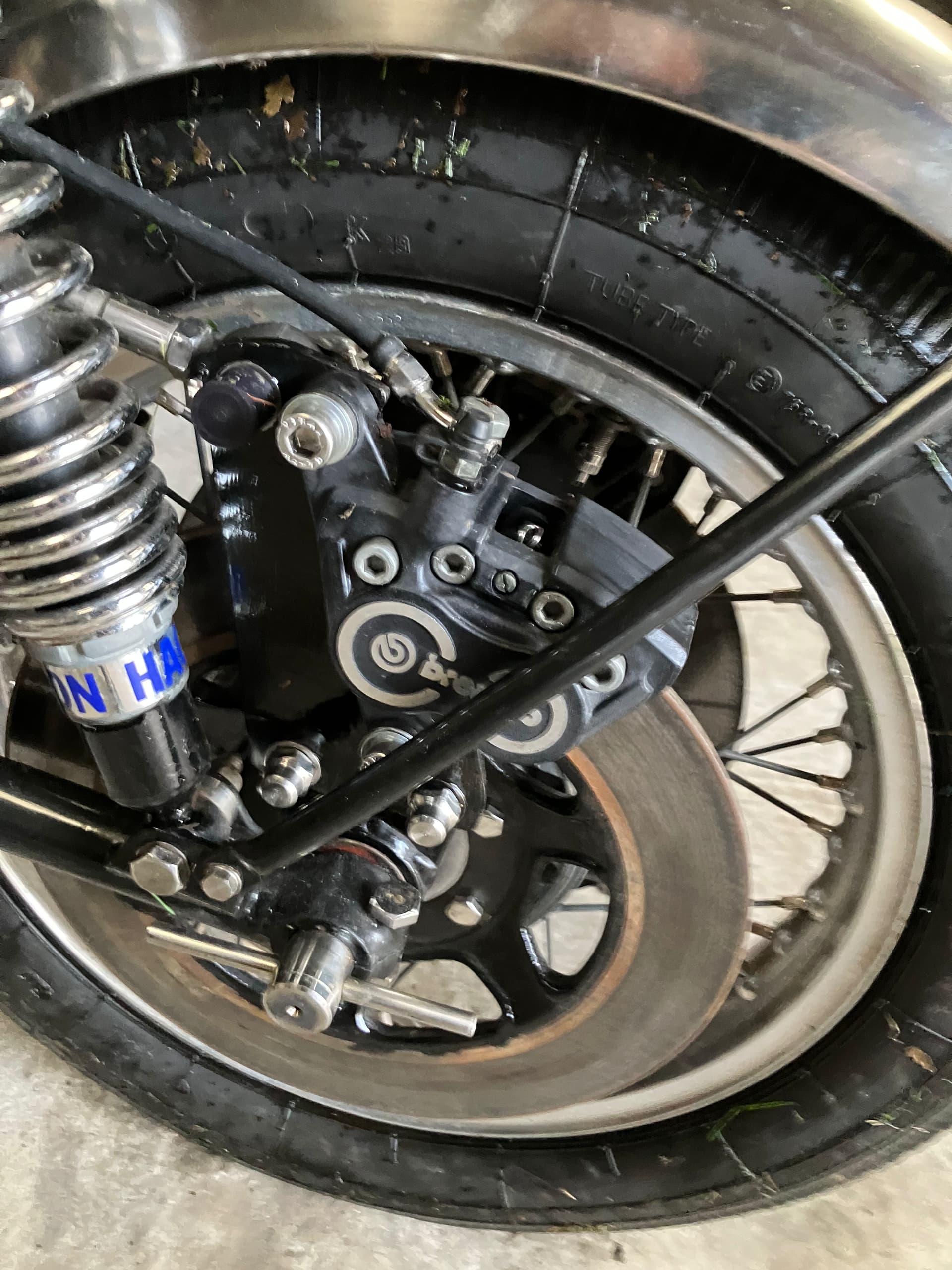just finished fitting and bleeding the 4 pot one matched to the 14 mm Nissin master and took it for a blast. Took a bit of spacing to centre the caliper. Probably easier to do without the complication of leading link forks. I can now lock up the front wheel with two fingers at 50mph on a wet road.