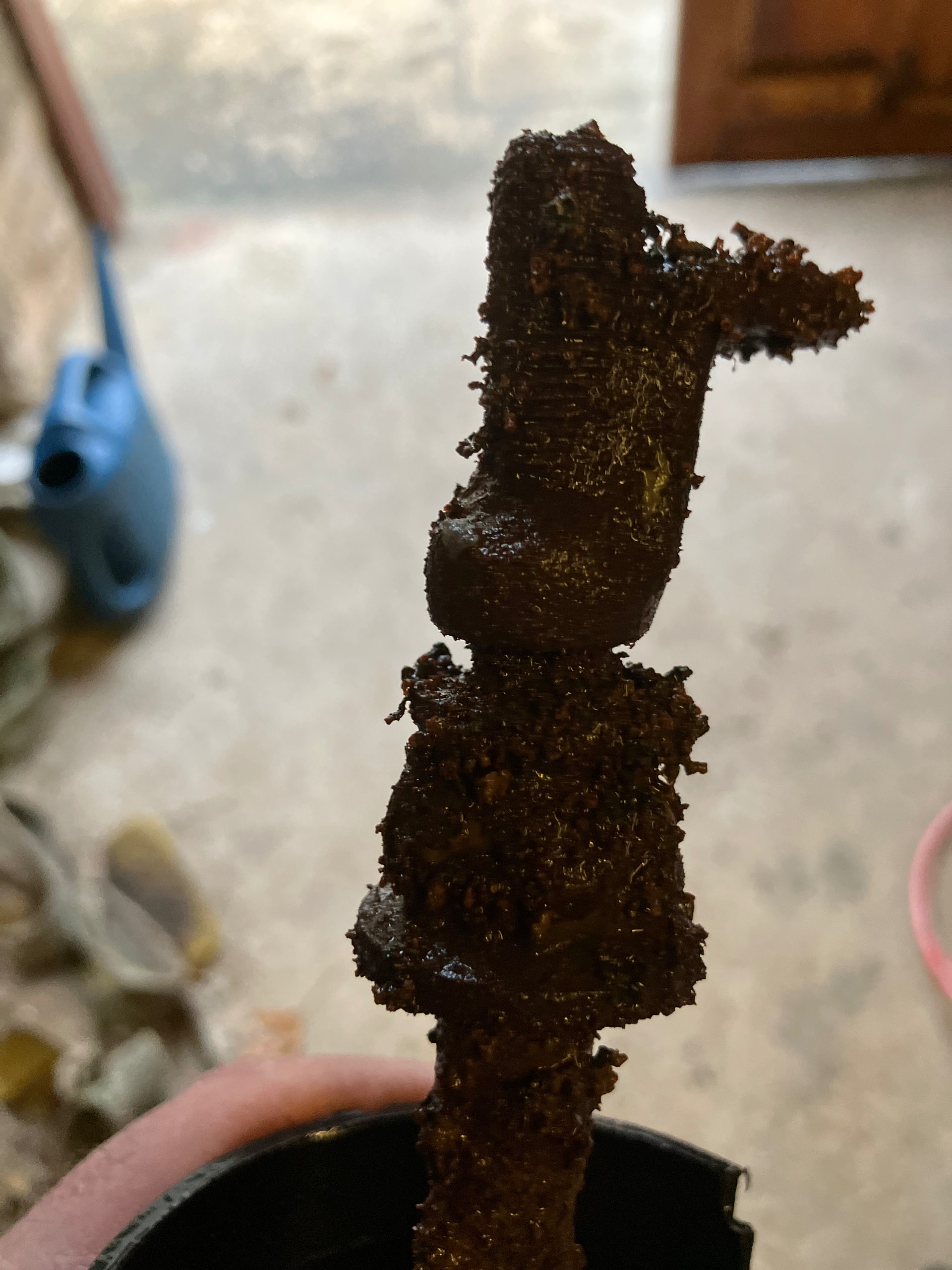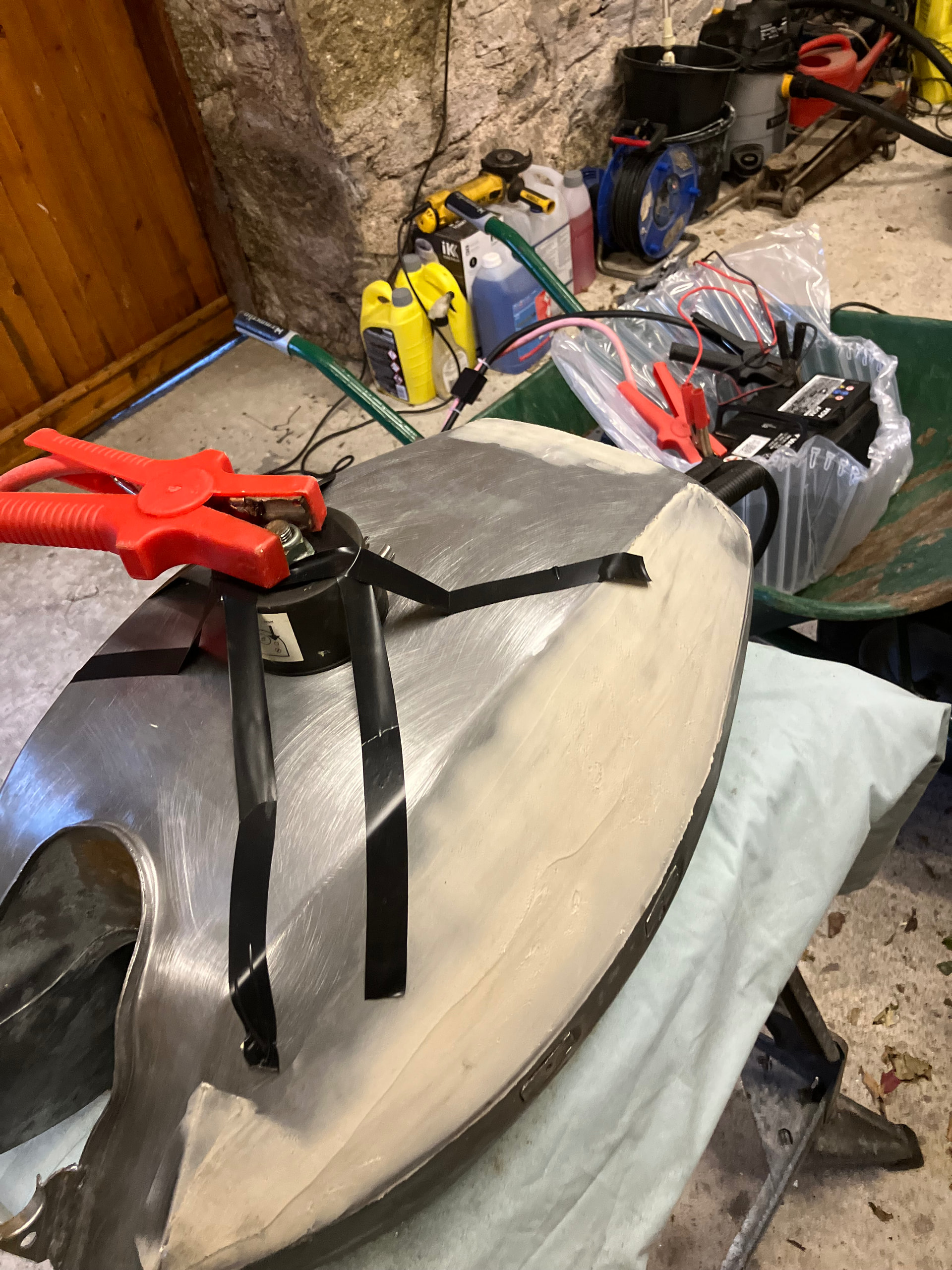 Picture is of the second day’s rust collection. The first day was considerably worse, but I didn’t have a camera to hand. The anode is two bolts welded head to head together along with a bit of a ring spanner end to enlarge the area. The anode extends 12 cm into the full tank of water/sodium carbonate mixture. The cap is an old water thermostat cap that snugly fits over the petrol cap orifice and even has the correct sized cut away to fit over the fuel cap mounting.