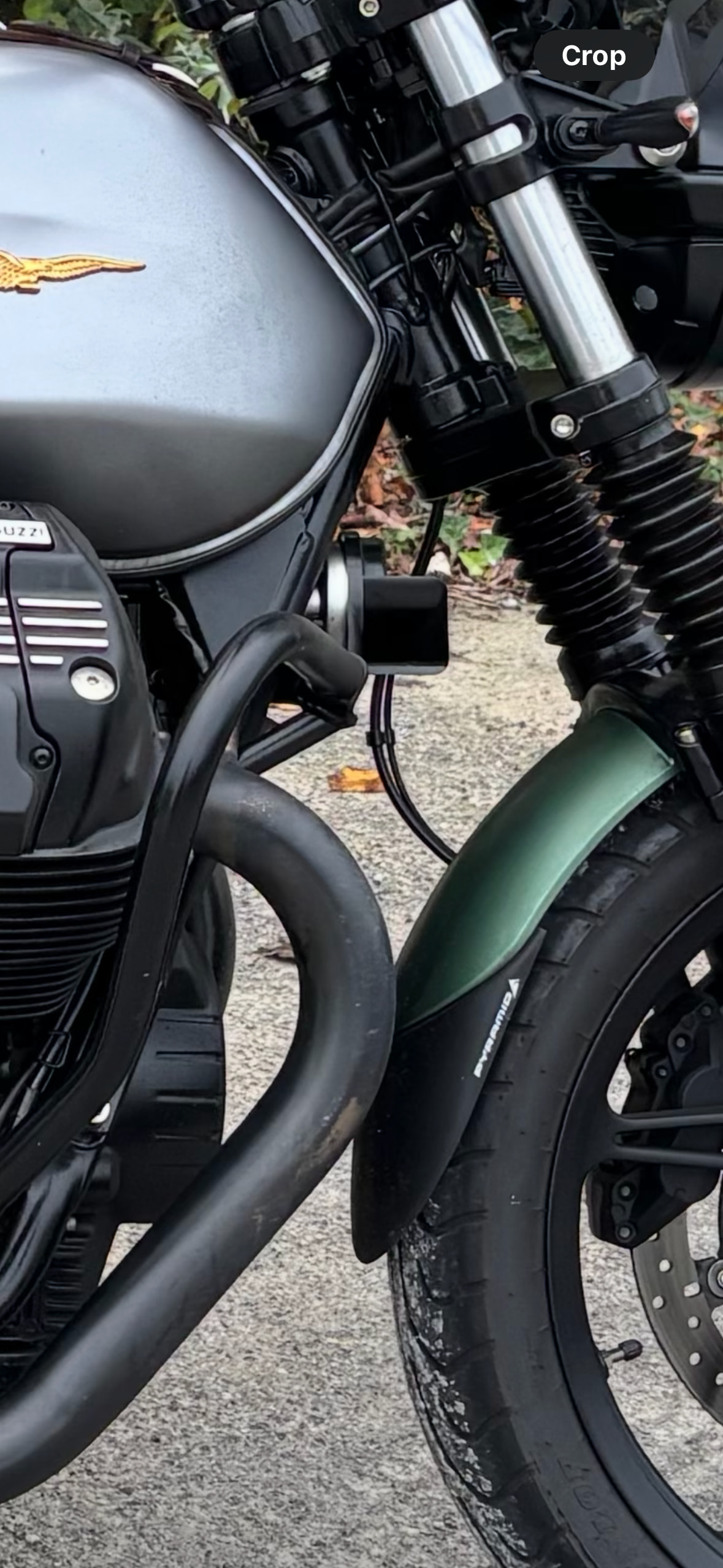 The horn on the V7 is, unfortunately, the other end of the scale of desirability, it sounds like a wasp in a tin. So I thought, no stress, I’ll avail myself of a ‘direct replacement‘ Denali Soundbomb Mini and bolt it to the oem bracket, job done. That is until I viewed a YT video of an owner who’d done exactly that only for the horn to impact the rear of the front mudguard when the forks compressed causing unsightly damage. Any advice in terms of a fitment solution gratefully received.