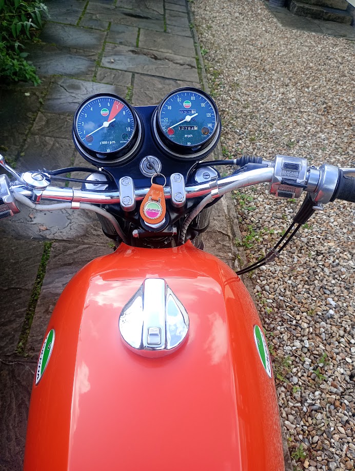 The bike was restored by previous owner to a very high standard, with unblemished paintwork and highly polished alloy. It is a matching numbers bike with Ceriani forks and rear shocks, Borrani rims with stainless spokes, ND clocks. Recently recommissioned with carbs stripped and cleaned, fresh oil, new battery. Runs well and ready to go. A real stunning example of a proper classic bike.