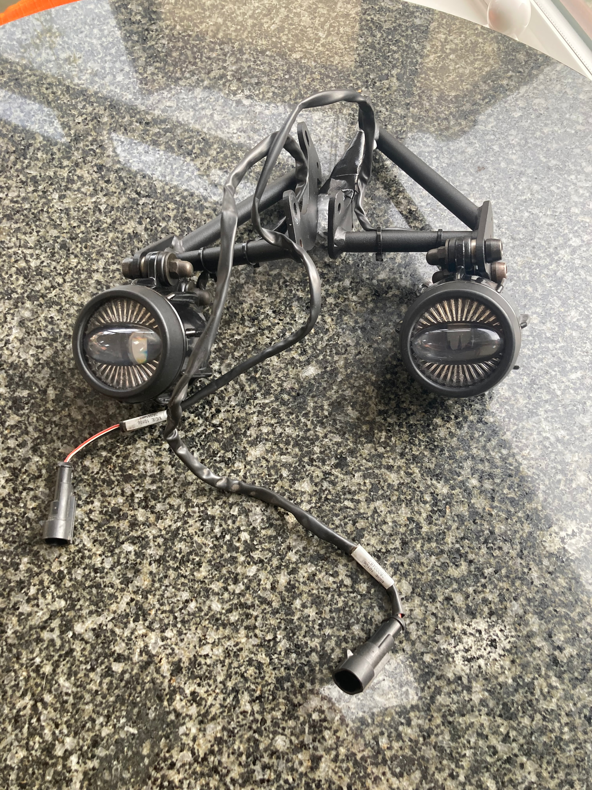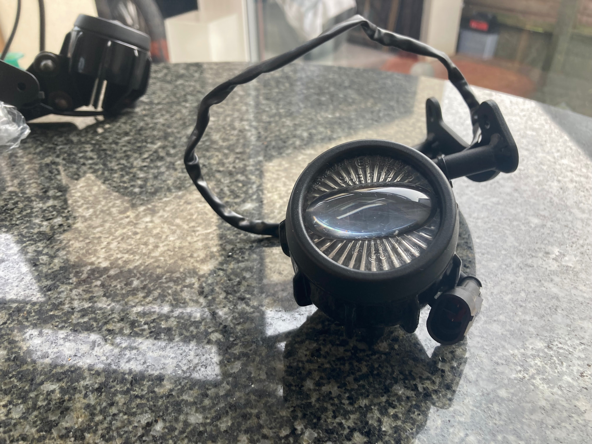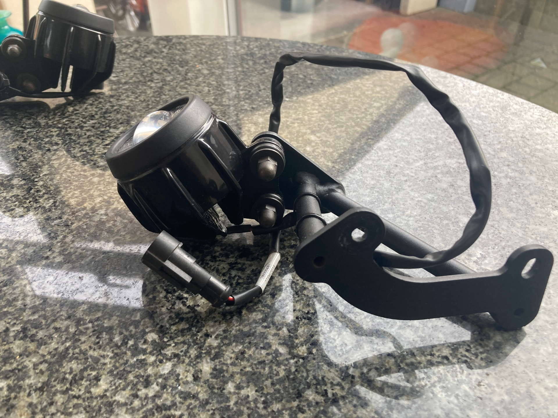 Moto Guzzi oem fog lamps set including the mounting brackets. Plug and play (plug into 2x superseal connectors behind the dash screen). Eye wateringly expensive new. Working minutes before I removed them. A bit of patched up corrosion on the body of the LH lamp, but they are aluminium alloy of some sort so won’t corrode much. Not unsightly and you don’t notice unless you know once on the bike. £200.