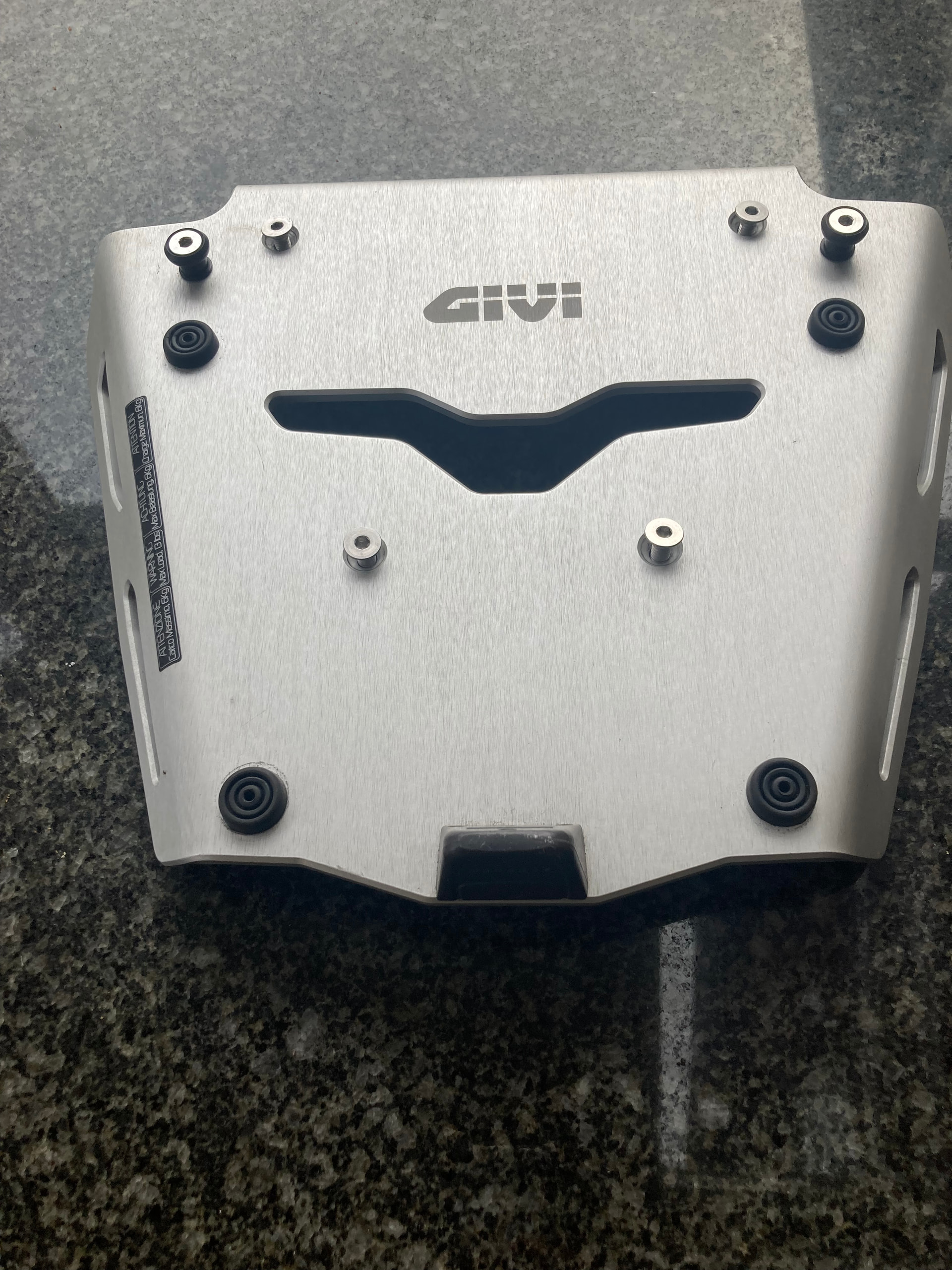 Givi Top Box plate. Plate itself is excellent but I bought it used but new without the fittings. I used some fittings from another old plate I had, which weren’t quite right (the rubber bumpers need a washer) and I made my own spacers. It fits just fine but could be better. I’ve an old battered but watertight top box you could have if you wanted it too. (Maxia and approx 45litres). £35.