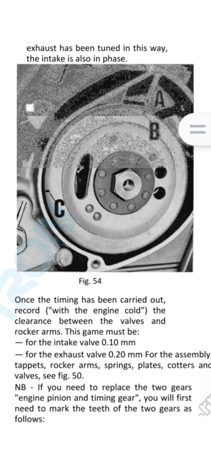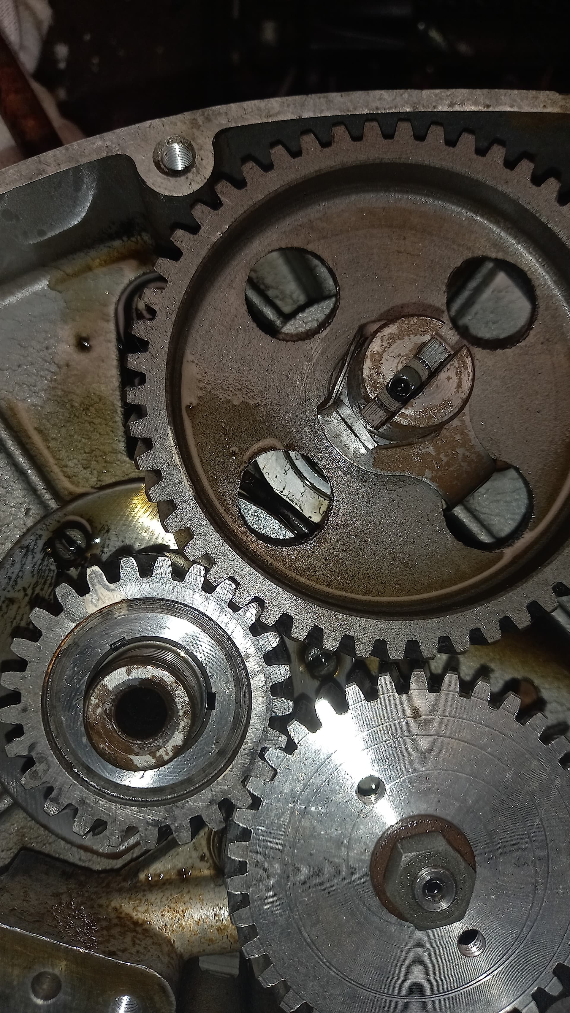downloaded the English version thanks. There is a bit of beige paint on gear wheels , acording to book page 48/49, they should line up when flywheel is rotated to “C” past TDC firing stroke ,But they don’t line up on mine. So not sure if paint is in wrong place. I know this motor has previously run, and I have not disturbed the the gear positions ,but I will have to ,to get crank out. Think I will have to mark and photo everything as is , and worry about it later when rebuilding.