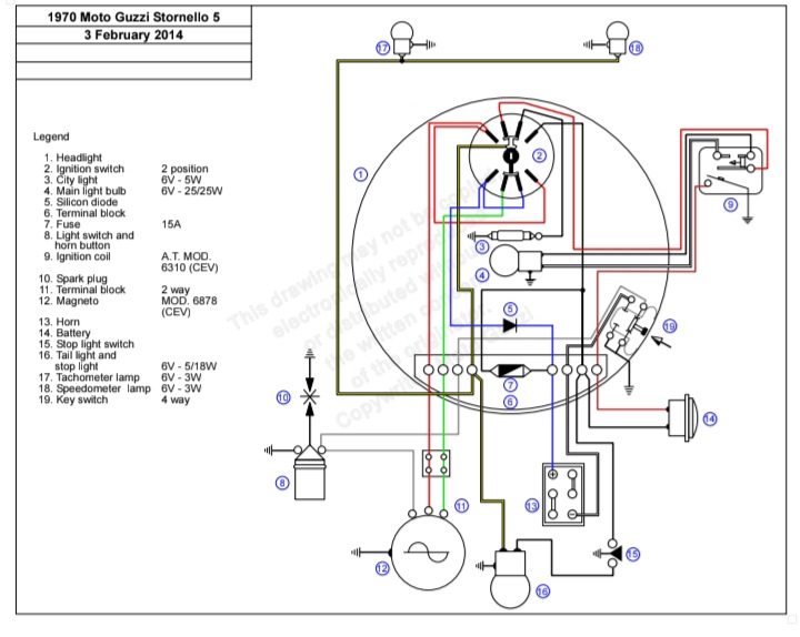 The connector block number 6 has a different layout to the one in the workshop manual I have found on the Guzzitech website (see here) which also shows the key switch as the same item as the ignition switch but these have been separated on Carl Allison’s drawing.